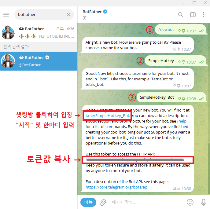 - 봇이 생성되면, BotFather가 **토큰(Token)**을 알려줍니다.