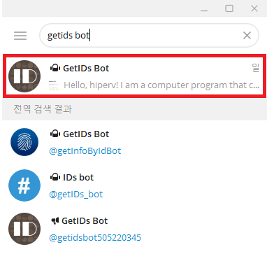 - 텔레그램에서 @GetIDsBot을 검색해 채팅을 시작하세요.