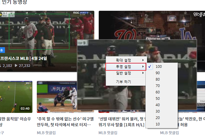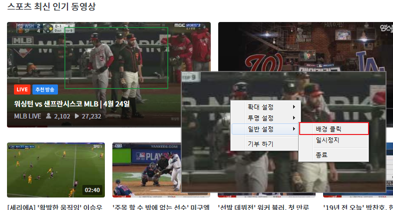 확대화면 투명도를 낮게 설정 하시고, 배경클릭을 활성화 하세요~