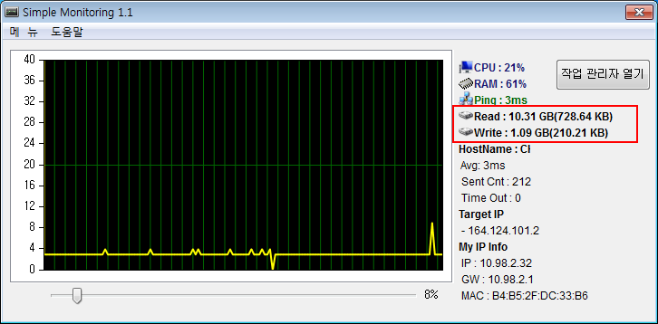 HDD 읽기/쓰기 사용량 기능을 사용 할때 CPU 점유율이 조금 올라 갈 수 있습니다.