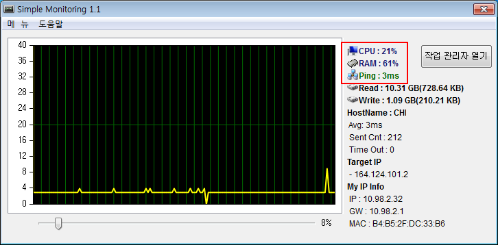CPU,RAM 사용량, 점유율을 확인 할 수 있고, Ping 지연, 끊김 상태를 볼 수 있습니다