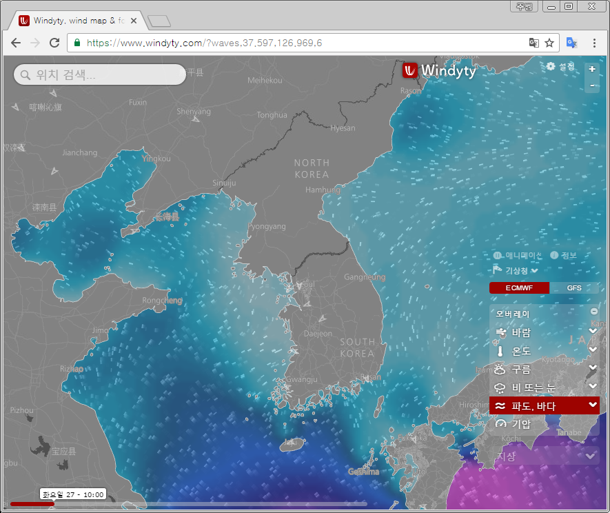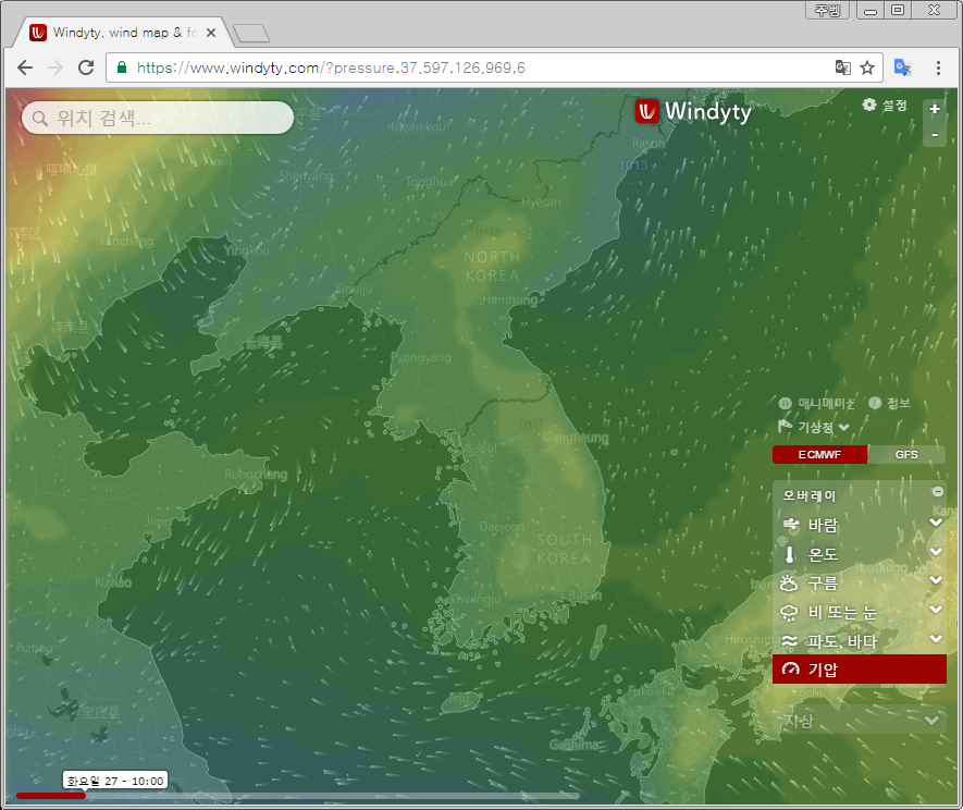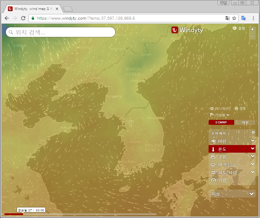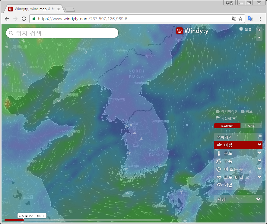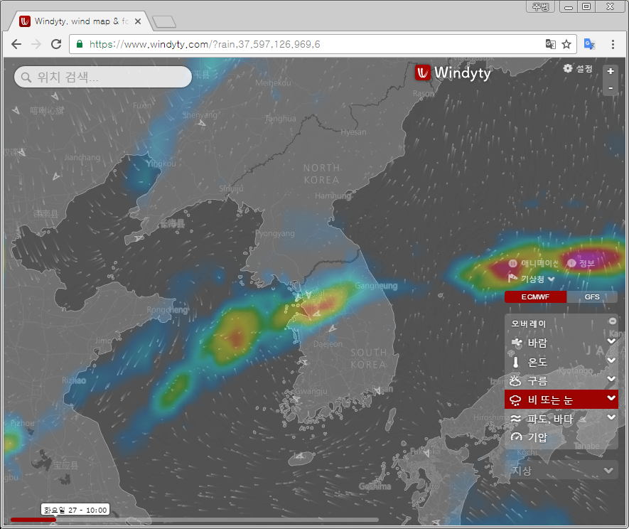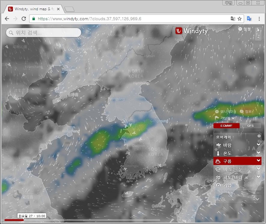 윈디티 사이트 기상지도 사이트 입니다. 장점은 구름, 바람흐름을 움직이는 화면으로 보여줍니다... -_-)=b